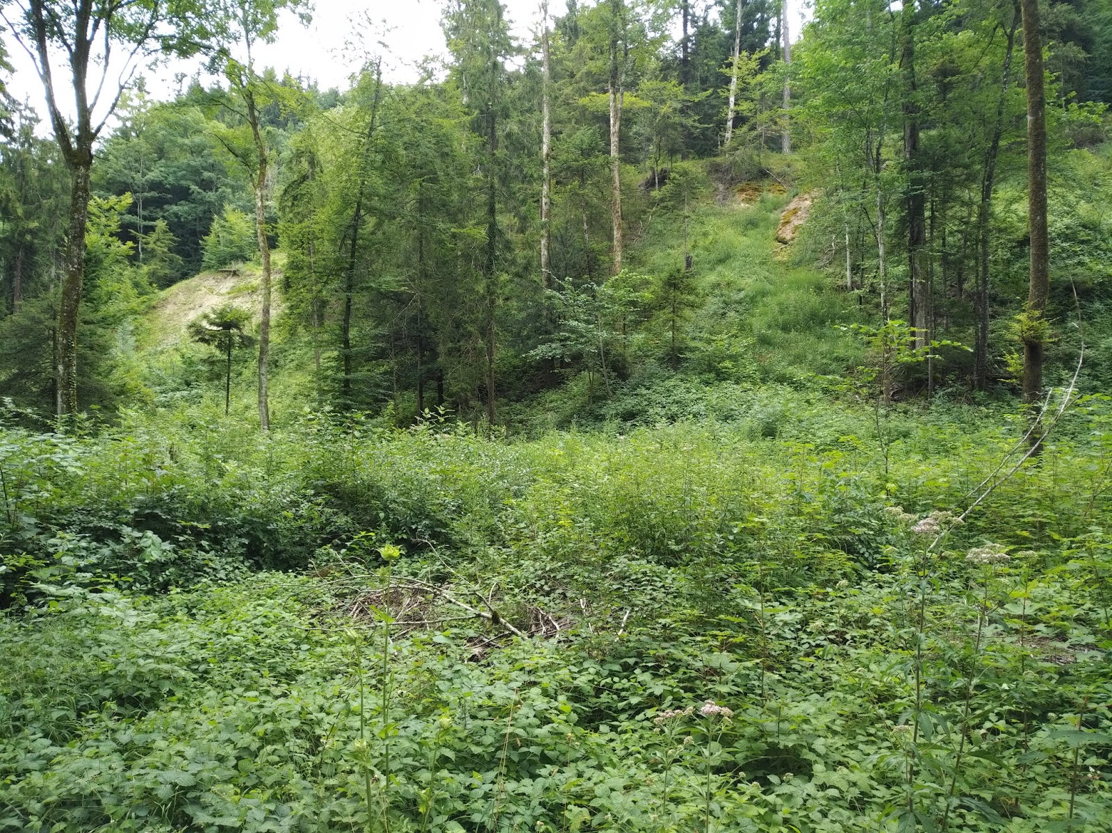 Nach genau einem Kilometer kommt man an eine erste Verzweigung, sinnvollerweise geht man dort geradeaus weiter, oder man nimmt den sehr steilen Abstieg Richtung Oberhofen im Tal in Angriff. Wir gehen hier jedoch geradeaus weiter und geniessen den nahezu flachen Weg. Er schlängelt sich in immer dichteren Kurven dem Gelände entlang und wir sind gespannt was uns die Vegetation noch zu bieten hat. Kurze eher sumpfige Gebiete wechseln sich ab mit dicht bewachsenen Waldstücken. Für Abwechslung ist auf jeden Fall gesorgt und wir geniessen den Artenreichtum direkt am Wegrand. Nach einem weiteren Kilometer beginnt nun die Steigung die uns Richtung "Grat" bringen wird. Sie ist moderat, geht in der Hitze aber durchaus in die Beine. Also unbedingt etwas zu trinken mitnehmen!